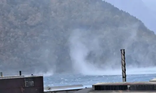 I båthavnen på Årdalstangen har mange kalesjer blåst i stykker. Vinden kaster sjøen mange titalls meter opp i luften. Se video.