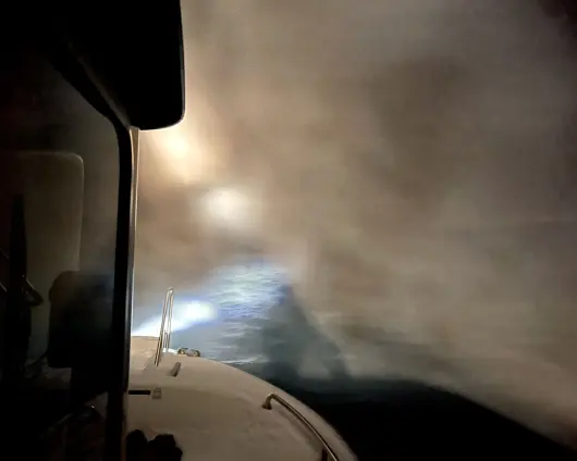 I båthavnen på Årdalstangen har mange kalesjer blåst i stykker. Vinden kaster sjøen mange titalls meter opp i luften. Se video.