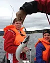 Vi hadde knapt passert Hvalstrand før fiskeentusiast og familiepappa Åge ville prøve fiskestanga. Ti meter bortenfor oss ble det nemlig trukket makrell fra en båt som så lå og duppet mellom skjærene. Snøret hadde knapt nok rukket å synke under overflaten før det nappet også hos oss. Et digert beist av en makrell spratt opp og ned i bøtta, til både store og små sin begeistring. Sekunder etterpå hadde vi huket inn lillebroren til beistet, og turen kunne fortsette utover.