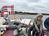 SISTE TUR: Med splittflagg og god stemning la gutta i Fredrikstad ut på siste tur med akevitten sin rundt "Driter´n," her med kaptein Petter Bjørge ved roret og Andreas Ihlebæk som passasjer.