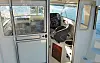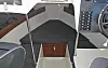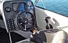 Bildene viser at båten får ei bred skyvedør fra akterdekket og inn i hytta. På babord side er det sitteplass for to personer, mens fører sitter alene på styrbord. Våre erfaringer med 200-skroget tilsier at tre personer på babord side og kun en på styrbord vil gi mye slagside. Derfor bør man absolutt velge trimflaps fra ekstrautstyrslista.