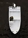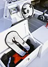 Båten har en beskjeden styrekonsoll på styrbord side, med en tversgående benk til å sitte på. Konsollen kan plasseres etter ønske fra kunden, og valgene står mellom styrbord forut eller akter, eller midtplassert akter. Her er komforten erstattet med praktisk arbeidsdekk, og båten har mange likhetstrekk med tradisjonelle åpne fiskebåter. Med i standardprisen får du brakett for teinehaler, noe som burde fortelle det meste om hvem båten er laget for.