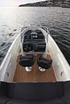 Den midtstilte styrekonsollen er enkel, men flott utformet, og har solide passasjer på begge sider. Den inneholder det meste, men vi savner et rom å legge fra seg småting i. Det burde det være rikelig med plass til i den brede dobbeltkonsollen. Vi gir plusspoeng for det sorte trekket som dekker oversiden av instrumentpanelet. Dette er en enkel løsning som sørger for at reflekser i vindskjermen reduseres til et absolutt minimum. Kartplotteren står bra plassert i siktretningen, og instrumentene er lettleste. Ønsker du større plotter enn femtommeren som stod i vår testbåt, er det fullt mulig å felle inn en syvtommer. Videre er gir/gass-kontrollen riktig plassert, men vi kan styre vår begeistring for den toppmonterte mekaniske motorspaken fra Mercruiser. Denne føles noe upresis, og tidvis er man i tvil om motoren er i gir eller i fri. Den nye 150-hesters firetakteren fra Mercury har vi imidlertid sansen for. Til tross for at den er markedets letteste 150-hester med firetaktsteknologi har den størst slagvolum av samtlige. Vibrasjoner fra påhengeren er redusert til et minimum med hjelp av et nytt opphengsystem der gummilameller skiller braketten fra selve motoren. På tomgang merker du knapt at 3-literen på akterspeilet er i gang. Men gir du gass har du krefter i massevis.
