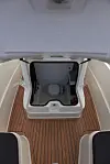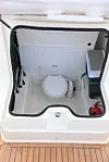 I forkant av konsollen finnes ei stor luke som fører ned til et romslig stuverom. For rundt 10 000 kroner får du et manuelt sjøvannstoalett plassert her. Luka kan lukkes fra innsiden, og selv voksne personer kan bruke toalettet med luka igjen. To bittesmå vinduer hjelper litt på klaustrofobifølelsen som kommer snikende. I toalettrommet er det også plassert en kjøleboks, tilkoblet et 12-voltsuttak. Videre har båten ei god trapp opp til det vesle fordekket. Opphøyd pulpit gjør at du også har noe å ta tak i ved ombordstingning. Puta på sittebenken forut kan fjernes for å unngå at gjester tråkker i setet ved ombordstinging. Denne lille puta vil sannsynligvis bare bli liggende og slenge, og til slutt bli stuvet bort for godt. Vippepute med borrelås- eller knappefeste vil være en bedre løsning, også her.