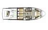 Panoramavinduer og glasstak i styrhussalongen skal bidra til at du får rikelig med naturlig lys inn i båten, samtidig som det gir deg følelsen av romslighet. De to gjestelugarene er begge utstyrt med eget bad med dusj i full størrelse. Nytt på denne modellen er at byssa er flyttet akter i salongen, noe som skal gjøre det enklere å ha flere til bords i styrhussalongen.
