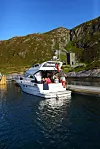 Da vi hadde bunkret opp, gikk vi ut til det nye og vesentlig bedre flytebryggeanlegget på nordvestsiden av øya. Her er det fint å ligge, og utsikten mot storhavet og Stad er mektig, og vender man blikket mot øya, ligger klosteret og ruinene som ble bygd på 1100-tallet, viet den engelske helgenen St. Alban som i følge legenden var St. Sunnivas bror. Hun skal ha vært en irsk kongsdatter som var så plaget av hedenske friere at hun midt på 900-tallet så seg nødt til å forlate hjemlandet. Sammen med et stort følge drev hun for vær og vind i Herrens hender, og havnet på Seljeøya. Det ble sendt bud på Håkon jarl da det ble klart at det var inntrengere på øya. Sunniva og følget hennes gjemte seg i en hule for å slippe unna vikingene, og ba til Gud om hjelp, som svarte bønnen med å stenge inngangen til hula med et steinras. Noe senere ble det sett et lysskjær oppe i fjellsiden. Olav Tryggvason ble varslet og han kom til at det måtte dreie seg om en helgen på øya. Sunnivas legeme ble funnet og oppbevart i et skrin.
