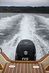 Båten skal kunne brukes med motorer fra 150 hk. og ned til 40 hk. Med en 115 Yamaha målte vi en toppfart på 25 knop. Det var som å kjøre go-kart. Båten heller hverken innover eller utover i svinger. Grunnen til det er en ganske dyp kjøl som gir båten halvplaneregenskaper. Den reiser baugen litt under gange, men det spruter og skvetter over baugen. Årsaken til det er først og fremst skrogformen forut med en veldig rett baug og mangel på skikkelige sprutlister, kun en tynn list som avsluttes med et ganske kraftig chine (overgang mellom skrogbunn og skrogside). Skrogformen hadde tjent på andre sprutlister, sett i lys av den rette baugen. Vi syntes for øvrig 115-hesteren passet bra, og tror neppe båten tåler 150-hester uten å vise fram unoter.