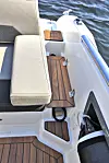 Legg også merke til taukassene både foran og akter. I baugen en åpen boks med lokk hvor du lett kan ta ut tauet uten å åpne lokket! Akter en smart oppbevaringsplass under trinnet ved siden av sofaen. Trinnet kan dekkes av en pute som gjør sofaen stor, puten kan vippes opp og tjene som armlener, samtidig som du har åpnet for god passasje ut på plattformen. Vi savnet imidlertid et godt gripetak for passasjene i aktersofaen. Det bør være en smal sak å få til.