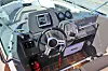 Du sitter eller stå behagelig bak en velfylt konsoll. Føreren sitter midt i båten og en passasjer kan greit komme seg inn og ut fra sideplassen uten at føreren må reise seg. Dette er en fin løsning, for på de fleste båter med sideplassert konsoll er passasjen låst inne. Riktig plassert på styrbord side av rattet sitter kontrollboksen. Kartplotteren er plassert fint i siktlinjen rett foran skipperen. I konsollen er det gjort plass til en hendig kjøleskuff. Den er ekstrautstyr, men siden det faktisk er plass til en så praktisk innretning i en så liten båt, så ta den med.