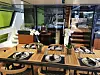 Den 24 meter lange båten som ble vist på årets messe var ikke noe unntak når det gjelder bekledningen av solcellepanel, som også setter en viss stemning i salongen, med lyset som skinner gjennom solcellene og inn. Ifølge verftet egner båten seg godt til kalde dager, med å holde godt på varmen. Men også de dagene sola steker kan man få behagelig klima innvendig, enten ved hjelp av båtens aircondition-anlegg, eller senke de elektriske vinduene rundt i hovedsalongen. Til middagen kan man slippe inn så mye havbris man måtte ønske. Vil man heller sitte ute, er det ene akterdekket på ikke mindre enn 65 kvadratmeter, og skal være båtens sosiale samlingspunkt. Rundt teakbordet skal det være plass til ti personer. Og skulle det likevel bli for mye trekk, er det bare å skyve ut vindskjermene i glass, som er skjult i en fordypning i overbygget. Akterdekket fungerer også som hjemmekino, med en enorm storskjerm som heises opp ved behov.