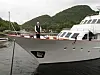 Jeg våkner brått kl 0630 av en ukjent lyd og spretter opp på dekk i bare trusa. Det er Benny fra Middelfart i Danmark, som seiler alene med bikkja og kom sliten til havn i går kveld, som kaver intil skutesiden på Antares. Han driver med forhaling av sin gamle 32 fots seilbåt. Årsaken sperrer det meste av utsikten ut over bukta - den 100 fots lange yachten ”Favorita” med 5 manns besetning og 4 særdeles pengesterke russiske passasjerer. De har purret Benny for at han skal flytte båten sin. På baugen står engelske Paul som jeg lå ved siden av i Bergen, og hans bergenske oppdragsgiver! Etter hastig hilsing hjelper vi til med en vanskelig tillegging hvor de okkuperer det meste av kaia bak Antares. Jeg håper de har avtale om å ligge der, for ankomsten og plassbehovet berører ganske mange vanlige båtfolk. Norskekysten er heldigvis tilgjengelig for både kong Salomo og Jørgen Hattemaker, men det er viktig å huske at Jørgen er den viktigste bæreren av kystkulturen vår!