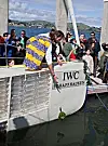 I god polynesisk tradisjon ble flaskebåten «Plastiki» døpt. En av gudfedrene var Olav Heyerdahl, som ledet prosesjonen foran dåpen.