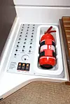 Ryddig: Under fotplaten ved førerplass er sikringspanelet og brannslukkingsapparatet lett tilgjengelig. Smart og ryddig.