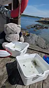 I dag startet vi dagen med krabbefiske, og jeg syntes først at det var litt skummelt. Heldigvis var det ingen som kløp meg i pelsen eller kravlet på meg, og straks ble skummelt til gøy!