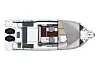 Dette er en baveggbåt med skyvedør. Det er også dører ut på begge sider av styrehuset, og sitteplass til fire inne i styrehuset. I salongen er det et rundt bord festet oppunder taket som kan trekkes ned, slik vi har sett på tidligere modeller av Barracuda og Jeanneau Merry Fisher, som bygges samme sted i Ostroda i Polen.