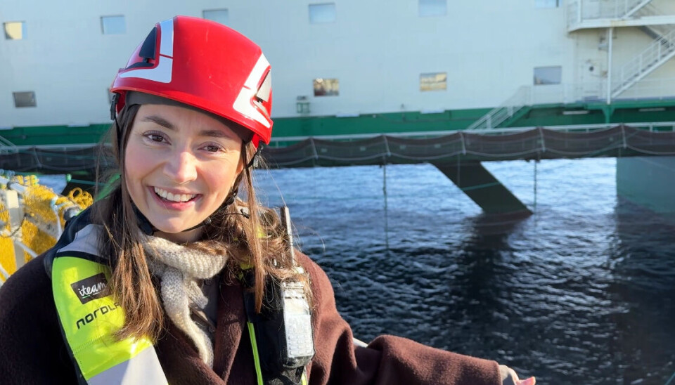 HADSELØYA: Astrid Stenvold i Nordlaks viser fram Verdens største havfarm til Båtmagasinet. «Jostein Albert» er 385 meter lang, lengre enn Eiffeltårnet og femti meter lengre enn hangarskipet USS «Gerhald Ford» som for en tid siden besøkte Norge. Farmen har seks laksemerder etter hverandre og kan huse 10 000 tonn laks.