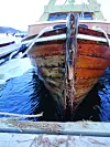 GNAGER SEG INN: Denne båten har spist seg inn i brygga. Foto: Danielle Rolim de Gois Finsrud.
