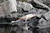 Han saktner farten og peker inn i et lite sund. Kadaveret av en hval ligger på fjæresteinene. Hvalen er rundt fem meter langt og bærer preg av å ha ligget i sjøen en tid.