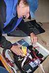 8) DU: Sjekk batteriet for syre og etterfyll om nødvendig. Mål spenningen til nær 14,4 volt. Sett til lading hvis under 12,7 volt. Smør polene med vaselin.