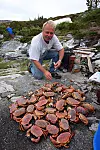 Tove og Nils Torsø, har hytte med brygge helt ned til vannkanten i en vakker lagune ikke langt fra Kvenværet. Dette var gode omgangsvenner av våre guider på turen, Wenche og Anders Hoff. De overrasket oss med hyggelig invitasjon om å dele dagens fangst av nykokt krabbe og en liten pils servert helt i sjøkanten. Vi fleipet litt om at familien Torsø nå kom til å bli nedringt av sultne båtlivlesere som hadde lest om deres gjestfrihet og krabbelykke. De fleipet tilbake at det skjedde titt og stadig at folk kom innom for å låne seg en bryggeplass for natta, og at de med liott reklame gjennom Båtliv kanskje kunne åpne en liten krabbekafe på naboens brygge. For deres egen var i utgangspunktet for liten. Vi takker og buker for gjestfriheten og kan vel ikke annete enn å føre det på kontoen over den generelle gjestfriheten som vi opplever når vi kommer rekende sjøveien i disse traktene. Kan man ha det bedre?