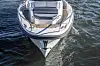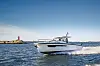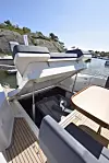 Tender-versjonen av det nye flaggskipet har en sosial og velfungerende dekkslayout. Når man entrer båten via den åpne og funksjonelle badeplattformen, kommer man inn på et sosialt akterdekk med en fleksibel seteløsning. Her kan man sitte i en U-sofa rundt et stort bord, men setene kan også vendes slik at alle sitter i fartsretningen. Det er rikelig med stuveplass i benkene, og i utenbordsversjonen er det dessuten et enormt stuverom i «motorrommet». En stor, hengslet motorromsluke heves elektrisk slik at man har full tilgang. Man har også adkomst via akterbenken. Båten har full walkaroundløsning, med brede, nedsenkede sidedekk. Forut er det en stor solseng på hyttetaket, og via sittebenken i forkant av hyttetaket har man adkomst ned til lugaren. En ypperlig løsning om man vil hive ned bager og så videre i lugaren. Luken fungerer også som evakueringsvei.