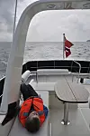 En liten rormann som gikk lei av at vi holdt samme kurs i en time. Han sovnet på broen. Disiplinærstraff er ikke vurdert.