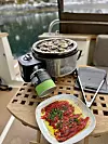 PÅ LAND: Den runde Magma-grillen egner seg like godt på land som på rekkefeste ombord. Legg merke til lokket, som gir skjerming mot vinden.