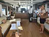 Innenfor bakveggen er det sofagrupper på begge sider. Byssa står lenger fram i tverrgående løsning, som en kjøkkenøy med bardisk, med kjøleskap fra Miele og ellers alt man ønsker av kjøleskap og kokeløsninger. Lengst fram, og opp et nivå, er førerplassen- Her passer det bedre å si broen med tre skjermer, ratt og joystick, og sittegrupper på begge sider av førerplassen.