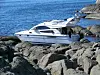 STJÅLET: Det var etter et tyveri at denne 40 fots Fairline Phantom havarerte i fjæresteinene på Vestre Imsa i Mandal i 2014. Store hull i skroget førte saltvann inn i motorrom og kabin. Foto: Privat.
