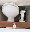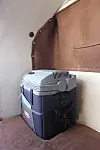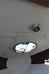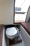 Inne i kabinen står en kjøleboks og et toalett med ferskvannspyling. Toalettet låses fast, avhengig om den skal stå gjemt under dørken eller stå framme. Låsen har ikke noe metallbeslag i dørken, der er det boret et hull rett gjennom glassfiberen. Vi legger også merke til at det ikke er noe til å trekke for takventilen. Finishen er også så som så innvendig, men dette er en prototype.