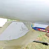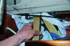 Dekk til innredningen. Bakplaten med glassfiber og epoksy presses opp nedenfra etter at laminatet er fuktet med epoksy. Kil fast reparasjonsbiten med lister e.l.Torsten Rasmussen