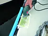 Stryk epoksy på stålplaten. Legg fire biter oppklippet glassfibermatte i epoksyen. Påfør mer epoksy med pensel og trykk ut alle luftbobler.Torsten Rasmussen