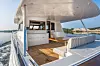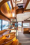 På den relativt høye båten er det brukt karbon og vinylester i overbygger for å holde vekten nede. Båten har tre kabiner og to bad. Innredningen er i teak.