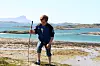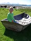 Vi velger en lettere turløype, nemlig den som går rundt skolen og langs Bolgetinden ned til gapahauken og de hvite strendene på yttersia. Her er det helt lunt, selv om det blåser godt på og sjøen går hvitt på innsiden av øya. Her ligger også øyas andre naturattraksjon ved siden av Bolgabørra; nemlig den store Ruggesteinen.