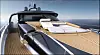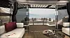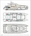 Katamaranskroget gir mer bredde for båten, som er 6,4 meter bred. Denne bredden har designeren utnyttet på akterdekket med en enorm sittegruppe, og videre en bred glassdør inn til den åpne og noe minimalistiske salongen. Under akterdekket er det garasjeplass til jolla. Ut fra hva vi kan se fra skissene har båten tre store lugarer og to bad.