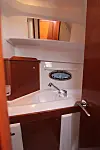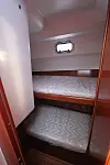 Båten har et lite baderom med vask, toalett og kombinert kran og dusj på styrbord side. Går vi in døra på babord side er det enda en kabin, her med to køye, og et lite skap. Her er det så trangt om plassen at man neppe kan stå opp eller legge seg samtidig.