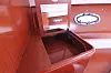 Kabinen i forpiggen har fått utnyttet plassen under dobbelkøye maksimalt til stueplass, i tillegg til et skap på styrbord side. På den andre siden er det sminkeplass, med et lite speil. For å spare plass har båten praktisk nok fått skyvedør. Her er det relativt god plass, men det er når vi forflytter oss videre rundt i båten at det virkelig begynner å føles trangt.