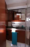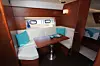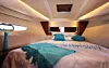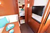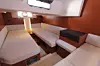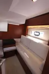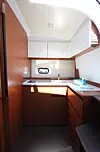 Nedunder venter positive overraskelser. Båten er 38 fot, men plassutnyttelsen her en god. På styrbord side når vi kommer ned leideren er byssa som vi har vært inne på. På babord side er en innbydende salong med lyse tekstiler i kirsebærtrepreget interiør. Forkabinen har en grei dobbelkøye med tilgang til et bad med do, vask og dusjmuligheter. Men båten har også en akterkabin med to enkeltkøyer og en sofabenk.