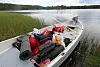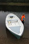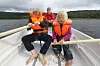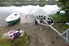Bak bilen har vi en henger fra Svela og en Terhi Saiman med en 2,3 hesters Honda på hekken. Fordelene med denne pakka anvendeligheten. Hengeren er lett å ha med seg, båten er god å ro og den kan brukes med motor. Første stopp er Mykle som ligger i Buskerud.