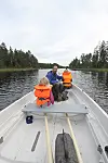 Vi setter ut og kjører innover Velmunden med motoren. Noe som er spesielt med Fjorda er hvor lytt det er. Spesielt om kvelden, når det som oftest er blikkstille, og vanlige samtaler kan høres mange hundre meter unna. Med dette i bakhodet har jeg nærmest dårlig samvittighet når vi kjører av gårde. Undervannsskjær er det også mye av i Fjorda. Selv om vi denne gangen bruker motor, vil jeg generelt anbefale å ta årene fatt, om det er kano, kajakk eller robåt.