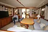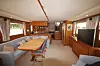 Selv generatoren i det store maskinrommet er ytterst diskret, og knapt hørbar under vegg-til-vegg teppene i den store salongen. Hele innredningen er i praktfull massiv teak fra Burma, som vil få enhver representant for Regnskogsfondet til å se rødt. Båtbygger Duncan Cowie forteller for øvrig til Båtliv at man nå vurderer plantasjeteak fra Brasil i stedet for trevirket fra de dype burmesiske skoger, som det nå er blitt knapphet på.