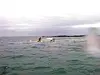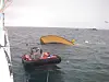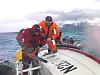 Hovedbildet: Maskinist på RS «Gjert Wilhelmsen», Ove Høyem fra Trøndelag, sager hull i skroget med motorsag. Mannen som holder i Høyem, er maskinsjef på RS »Kaptein Skaugen», Svein Kalvø. Alle foto: Redningsselskapet
