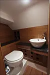 Selv om dette er en daycruiser på bare 7,5 meter, har den fått god soveplass under fordekket, og et bad med vask og toalett. Vi kjenner igjen mye av båtens design fra Delta 54 IPS, men størrelsen blir selvfølgelig en helt annen. Nærmer du deg 1,80 i høyde må du belage deg på å sitte med krummet nakke under toalettbesøket. Båten har lys innredning under dekk, noe som hjelper litt på romfølelsen.