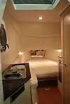 I styrekonsollen, til babord for førerposisjonen, er en skyvedør ned til kabinen. Til tross for at dette er en RIB, er ståhøyden nede i kabinen på 1,70 meter, noe som igjen vil si at mange må gå krumbøyd for ikke å stange hodet i glassfiberen.