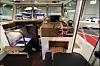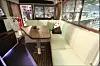 Salongen har en sittegruppe i respektabel størrelse, og i tillegg er det stor dørkplass inne i styrehuset. Føresetet er gassdempet, og bak setet er det skapplass med egen TV-benk, for å senke opp og ned flatskjermen. Store vinduer slipper inn bra med lys, og de er med persienner for å dempe belysningen bed behov.