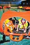 TESTERE: Janna Nevra Aarvik og August Nissen-Lie brukte en hel dag på å snu og komme seg om bord i ti forskjellige flåter. Her i testens beste, men dyreste flåte, Viking Resque Pro.